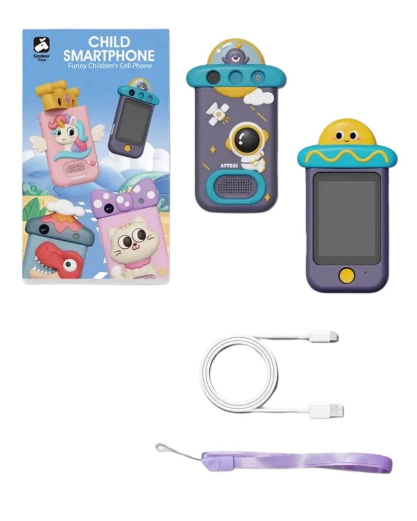 این گوشی هوشمند اسباب بازی کودکان دارای صفحه نمایش لمسی 2.8 اینچی، دوربین دوگانه، ضبط ویدیو، بازی های آموزشی، موسیقی و ابزارهای مفید مانند زنگ هشدار و ماشین حساب است. همچنین شامل یک قاب سیلیکونی نرم، کابل USB و یک بند برای حمل آسان است.